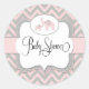 Este design de adesivo tem um dentro de elefante mama e bebê no topo do texto que diz Chá de fraldas. O fundo é cor-de-rosa e impressão de fêmur de cinza.