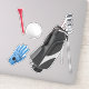 Adesivo de vinil com corte personalizado com a imagem de um saco de golfe preto, luva de golfe azul, bola de golfe branca e chá vermelho. Ver toda a coleção de adesivos do Pai nos CONVITES| Seção Stickers & Labels