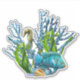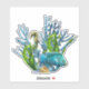 Um adesivo de vinilo de corte personalizado com uma imagem de um recife de coral colorido onde há lindos corais azuis em meio a algas verdes brilhantes, um cavalo de mar amarelo mosqueado, um peixe azul fantástico e conchas. Consulte a marca de favor correspondente. Ver toda a coleção do "under the Sea Sticker" nos CONVITES | Seção Stickers & Labels
