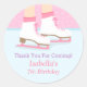 Vinhetas para decorar os sacos de presentes e favores para uma festa de aniversário de patinação de gelo! Ele se concentra nos pés de uma garota que está vestindo um par de skates brancos com cadarços cor-de-rosa e lâminas de skate. Ela está patinando em uma pista de patinação no gelo. Excelente para aniversários envelhece adolescentes para adolescentes. Personalize facilmente com sua mensagem de obrigado!