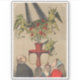 Poster de circo Vintage mostrando quatro pessoas olhando para três demônios verdes no pedestal retirando cobrir do buquê de rosas, cerca de 1870.
