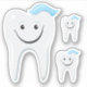 Vinheta com um dente de desenho animado feliz com pasta de dente azul. Conjunto de três adesivos
