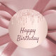 Um adesivo para uma festa de aniversário feminina. . Um fundo rosa dourado com pingos, pintura pingada. O texto: Feliz Aniversário é escrito em ouro rosa escuro com um grande estilo escrito à mão moderno.