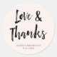 Esses adesivos de casamento modernos e frescos apresentam um roteiro preto manuscrito que diz "amor e obrigados" em um fundo cor-de-rosa pincelado.