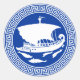 Design grego clássico com navio de vela grego e golfinhos brincalhões. Azul branco.