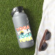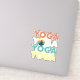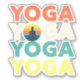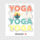 Design de texto "Yoga, Yoga, Yoga, Yoga, Yoga, Yoga", de estilo retrógrado, com uma rapariga em yoga, posiciona sobre decoração de fundo com estilo retrô listrado colorido