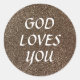 Você pode personalizar este texto ou manter as palavras inspiradoras "Deus te ama". Este adesivo de fé cristã é escrito em um moderno e elegante roteiro branco sobre um fundo falso de ouro brilhante. Este martelo é simulado com muitas saliências de ouro pretas. Este adesivo personalizado de tendência de na moda pode ser personalizado com um nome ou outra palavra-chave. Também pode ser encomendado a granel, como é o caso de ocasiões baratas. Seria um presente excelente para truques, travessuras ou sanduíches, páscoas ou Natal. Pretende-se encorajar as crianças e os adultos a serem amados pelo seu Pai celestial com um amor eterno. Veja outros designs nesta coleção de expressões cristãs e de ditados religiosos. Excelente de uma igreja cristã ou de senhoras religiosas, presentes na escola de domingo, favores da escola de Bíblia.