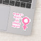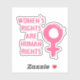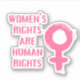 Vinyl sticker com uma mensagem feminista, apresenta um símbolo feminino cor-de-rosa e o texto "os direitos das mulheres são os direitos humanos" em estilo pincel traçado em fundo preto.