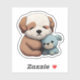 Um filhote de fofinho encolhido ao lado de um brinquedo de pelúcia, perfeito para mandar a alguém que precisa de um pouco de amor extra.
