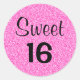 Um adesivo giro de 16 redondos com brilho quente, brilho rosado, brilho brilhante, brilho brilhante, brilho e escrevendo negro.
