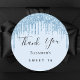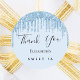 Um adesivo para uma giro e glamourosa festa de aniversário 16, 16. Um fundo azul claro com brilho azul de bebê, pingos de brilho, pintura pingando. O texto: Obrigado é escrito com um grande estilo escrito à mão moderno. Personalize e adicione um nome.