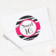 A design moderna de zebra é uma forma criativa de convidar pessoas para o seu partido! Adicione estes adesivos circulares de 3 polegadas à frente e atrás de grandes pirulitos e os entregue como convites para o seu partido! Este é o autocolante (parte 1) do convite. Design apresenta um fundo preto e branco de faixa zebra com uma banda rosa-quente e círculo através do centro. Dentro o círculo rosa quente é uma área branca sólida com texto em letra preta que diz Sweet 16, no entanto o texto pode ser personalizado para satisfazer as suas necessidades. Aplique o Doce 16 de Zebra Rosa Lollipop Convidado de Volta (vendido separadamente) no verso do pirulito para um convite completo!