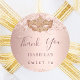 Um adesivo para uma giro e glamourosa festa de aniversário 16, 16. Um fundo rosa dourado com rosa dourado e confete cor-de-rosa e uma máscara mascarada. Personalize e adicione um nome. O texto: Obrigado é escrito em ouro rosa escuro com um grande estilo escrito à mão moderno.