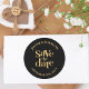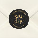 Capturar a essência do romance com nosso Dourado personagem romântico negro salve a data de casamento Clássico redondo. Elegante e eterno, seu design preto e ouro evoca sofisticação e luxo, dando o tom para seu dia especial. Personalize com seus nomes e data de casamento para criar uma manutenção única para seus convidados. Perfeito para selar envelopes ou decorar favores, este adesivo garante que seu anúncio de casamento é memorável e reflete a beleza de sua história de amor.