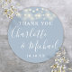 O obrigado de casamento azul Dusty favorece o seu colante redondo clássico com luzes de cordas bonito e nomes de estilo de assinatura. Personalize com seu obrigado especial você detalha na tipografia branca moderna. Projetado por Thisnotme©