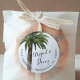 Um adesivo de etiqueta de endereço de casamento inspirado em praia, com uma imagem aquosa de uma palmeira poeirenta de solteiro.