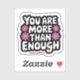 Este adesivo vibrante e animador apresenta a poderosa frase "Você é mais do que suficiente" em tipografia ousada e lúdica que irradia o amor próprio e o empoderamento. Ao redor do texto estão um conjunto de flores coloridas e faíscas, delicadamente arranjadas para melhorar a mensagem elevatória. Colocado contra um fundo cor-de-rosa suave, o design evoca calor, cuidado e positividade, o fazer é um belo lembrete da autoestima. Ideal para diários, espelhos, capas de telefone ou espaços de bem-estar mental, este adesivo inspira confiança diária e afirmação suave.