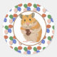 This colourful Easter sticker features a central design of my portrait of a cute golden hamster clutching a chocolate Easter egg with colourful patterned eggs in the background. Lovely to add to all your Easter gifts and cards.