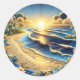 Representação de um pôr do sol do oceano com bonito ondas azuis, uma praia arenosa, palmeiras e flores feitas em um efeito 3D de coloração de papel.