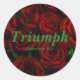Lindas rosas vermelhas florescem com a palavra "Triumph" em caracteres elegantes, acompanhadas por um inspirador verso bíblia Ephesiano 6:13. Uma mistura perfeita de natureza e fé.
