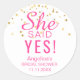 Etiquetas/etiquetas personalizadas e adoráveis para favores de presentes de chá de panela ou de baquelorette ou selos de envelopes. "Ela disse sim!" com letras cor-de-rosa HOT com confete dourado e fundo branco. Modelos editáveis - adicione seu texto.