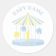 Este presente de aniversário e adesivos de correio publicitários contém um carrossel colorido com elefantes e um grande número de aniversário.