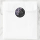 This moody and romantic round sticker is perfect for favor labels or envelope seals. The top left features a soft arrangement of deep purple, dark gray, and black flowers and leaves for a subtle boho gothic touch.