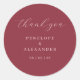 This elegant wedding sticker features a minimalist design with a rich maroon background, creating a sophisticated and formal atmosphere. The layout includes cursive script for the phrase "thank you" in a soft pink hue, complemented by clean, uppercase sans-serif text for customizable names and date placeholders. The overall style is modern and understated, perfect for expressing gratitude at weddings or other special occasions. With its simple yet refined typography and color palette, this sticker conveys a mood of appreciation and celebration.