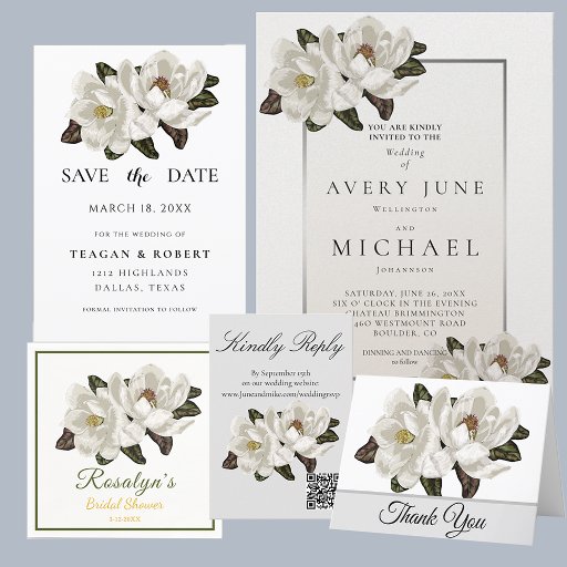Comemore seu dia especial com um elegante design floral com um marfim e um sage magnolia florescente. Altere o nome e a data para se adequar ao seu evento.