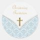 Elegante adesivos batizantes azuis. Este belo adesivo azul damask e dourado batizante é facilmente personalizado para o seu evento, adicionando detalhes do seu evento, estilo de fonte, tamanho e cor da fonte e texto. Observe que todos os adesivos, cartões e designs de convite que você encontrará no Zazzle são gráficos impressos sem joias reais, arcos, levantados, gravados, ou peças ou peças adicionadas.