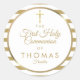 Ouro elegante e listras brancas Primeiro adesivo da Comunhão Sagrado com uma cruz de ouro com uma elegante borda de folha de ouro que enquadra seus detalhes especiais do evento de celebração, estabelecidos na tipografia moderna. Projetado por Thisnotme©
