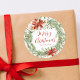 Vinhetas florais elegantes de Natal, com "Feliz Natal" num guião vermelho rodeado por uma coroa de poinsetos vermelhos, rosas de natas, ramos de pinheiros, bagas sagradas e outros verdes de inverno. Personalize os adesivos poinsettia com seu nome ou texto personalizado em letras vermelhas.