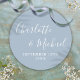 Com nomes de estilo de assinatura e data especial, este adesivo elegante pode ser personalizado com seus nomes em tipografia branca elegante em um fundo azul desbotado. Você pode personalizar o fundo para a cor do tema do casamento favorito. Criado por Thisisnotme©