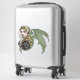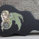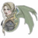 Uma mulher guerreira loura cabeleira vestindo uma armadura joalheira. um pequeno dragão verde fica no ombro do elfo loiro.