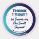 Melhore a promoção, marca e embalagem do seu negócio com este lindo rótulo adesivo redondo de produto moderno e profissional. Ele apresenta textos "Obrigado por Apoiar Nosso Pequeno Negócio" com fontes negrito e manuscritas bonitas. A moldura circular em gradiente azul-marinho e azul-teal minimalista e sofisticada com fundo rosa e elementos visuais de folhas e corações adicionam à criatividade do design. Personalize-o adicionando o nome da sua empresa ou negócio e site. Você também pode editar outros detalhes usando a ferramenta de design.