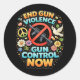 A bold, colorful protest-style illustration calling for peace and gun control, featuring a crossed-out rifle surrounded by symbols of unity and hope.