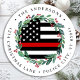 Adicione o toque final aos seus envelopes, cartões de Natal e papel de carta com esta única etiqueta de endereço de retorno do Thin Red Fire - Feriado em um design de bandeira americana em cores do Firefighter Flag, vermelho e branco preto moderno com holly e bagas. Personalize com o nome e endereço da família. Esta etiqueta de endereço de volta de Natal para bombeiros é perfeita para famílias de bombeiros ou cartões de natal de bombeiros. COPYRIGHT © 2020 Judy Burrows, Black Dog Art - Todos Os Direitos Reservados. Bombeiro Fino Linha Vermelha Wreath Address Classic Round Sticker