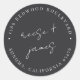 Projetado para combinar com nossos convites de casamento em linha. Uma bela design baseada em tipografia, com um toque minimalista, com moderno guião branco manuscrito e letras clássicas de serifa num fundo preto suave. Personalize com seus nomes no centro e seu endereço de retorno em um layout circular.