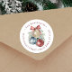 Estas elegantes etiquetas de endereço de volta redondas de férias têm um conjunto de 3 Enfeites de natal penduradas em galhos de pinheiro, decoradas com um arco vermelho, com o nome e endereço num círculo externo.