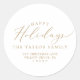 Estes delicados feriados alegres em ouro retornam os adesivos são perfeitos para um cartão de feriado ou envelope de convite moderno. A design romântica minimalista apresenta uma magnífica e elegante tipografia amarela ouro champanhe num fundo branco com um aspecto simples e limpo.