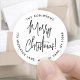 Adicione um toque de fim de na moda aos envelopes de cartão de feriado com as selagens de envelope de endereço de retorno de Feliz Natal. Toda a redação neste modelo é simples de personalizar ou excluir. A design a preto e branco apresenta a caligrafia moderna do guião manuscrito e o endereço minimalista da tipografia em círculo. Essas etiquetas de endereço de volta redondas únicas fazem uma adição elegante aos cartões de Natal e aos convites para festas de feriado.