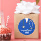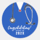 Enfermar a graduação da escola felicita os adesivos de presentes e as legendas de festa que contêm esfregões médicos e uma ilustração do estetoscópio. Para personalizar, edite texto.