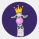 Um adesivo com uma lama branca soprando uma bolha rosa enquanto mascava chiclete. Vestindo uma coroa dourada e uma gravata arco preta. Fundo roxo escuro.