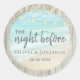 Este adesivo de janto do ensaio de casamento apresenta uma bela cena azul aqua de praia de ondas oceânicas a bater na costa, acentuadas com luzes de cordas, enquadradas com madeira rústica de cinza.