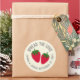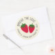 Dois morangos ilustrados são enquadrados por texto personalizável para fazer desses adesivos redondos uma forma doce de rotular o casamento ou chá de compotas ou conservas de morango e espalhar o amor para amigos e familiares e comemorar a data do casamento do casal.