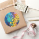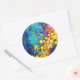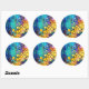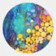 Uma pintura apresenta bolhas de cor vívida contra fundo azul profundo no estilo de abstrato geométrico. As cores são ricas e vibrantes, criando um visual atraente e dinâmico.
