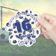 Esta equipe colore adesivo de futebol para meninas ou meninos apresenta a imagem de um punhado de bolas de futebol azuis, pretas e brancas de tamanho variado, sobre as quais você pode personalizar o nome do jogador, número de camisa, nome da equipe e nome do mascote - por katz_d_zynes