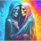 LGBTQIA+ Dois esqueletos amontoados sob um cobertor com fundo arco-íris.