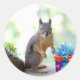 Um esquilo se posiciona entre dois presentes embrulhados intensamente nesta fotografia original.