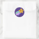 Uma estrela gira, feliz e balançando ouro com uma cauda azul, verde, rosa e roxa listrada voa através de um céu cheio de estrelas roxas. A trabalho de arte é desenhada num estilo de desenho animado e divertido.